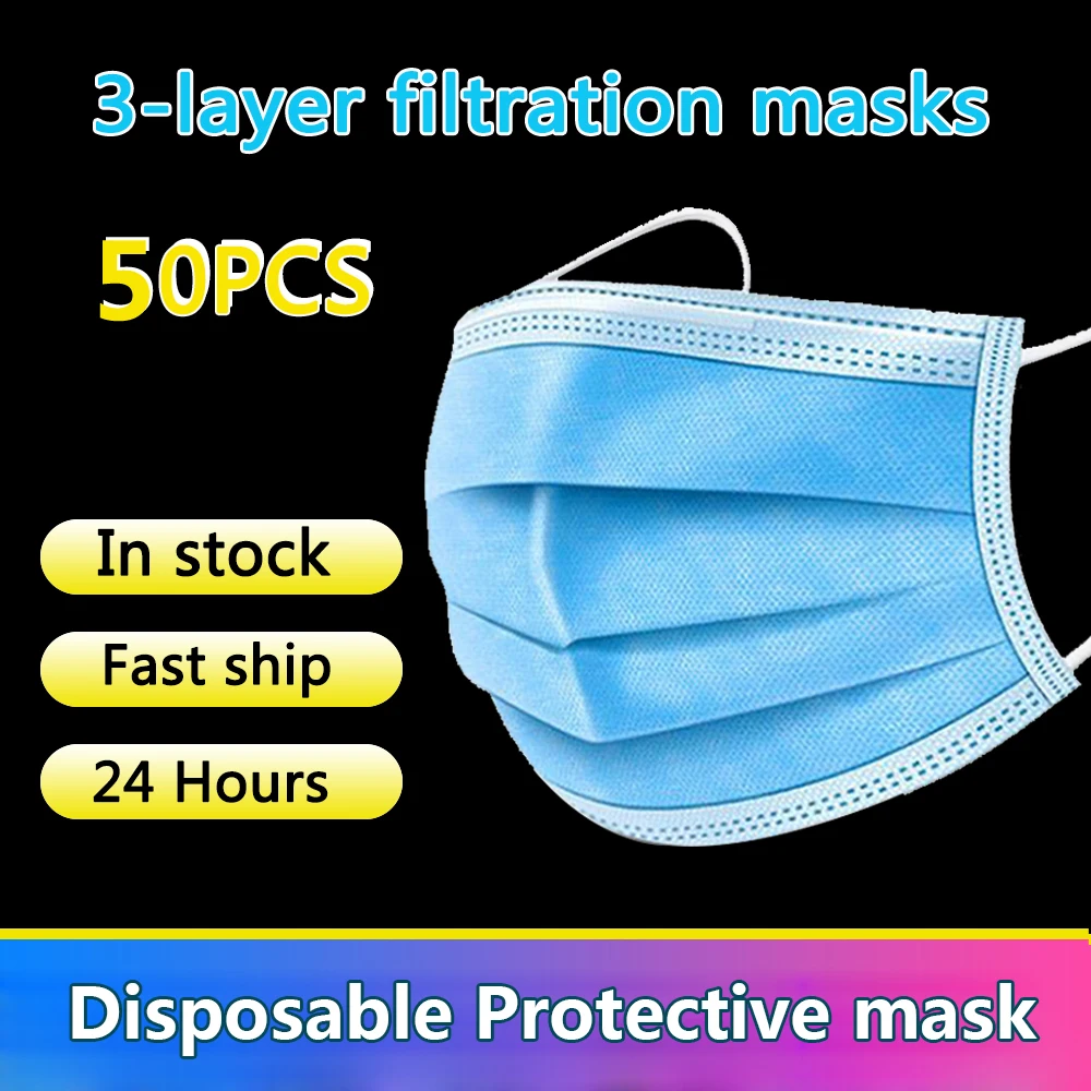 Fast Delivery Hot Sale 3-layer Mask 50pcs Face Mouth Masks Non Woven Disposable Anti-Dust Meltblown Cloth Masks Earloops Masks
