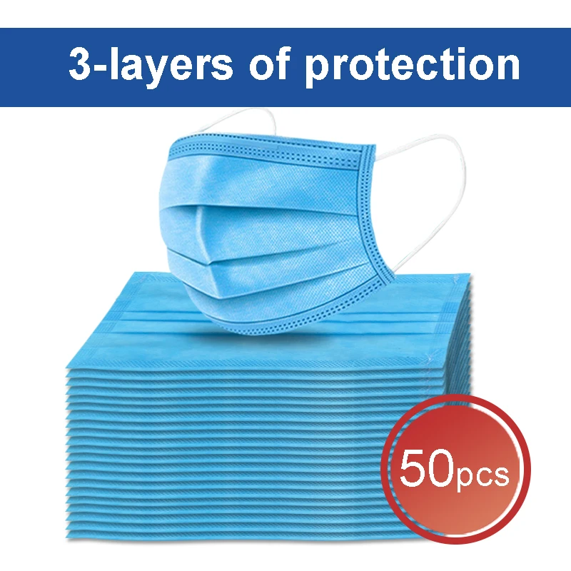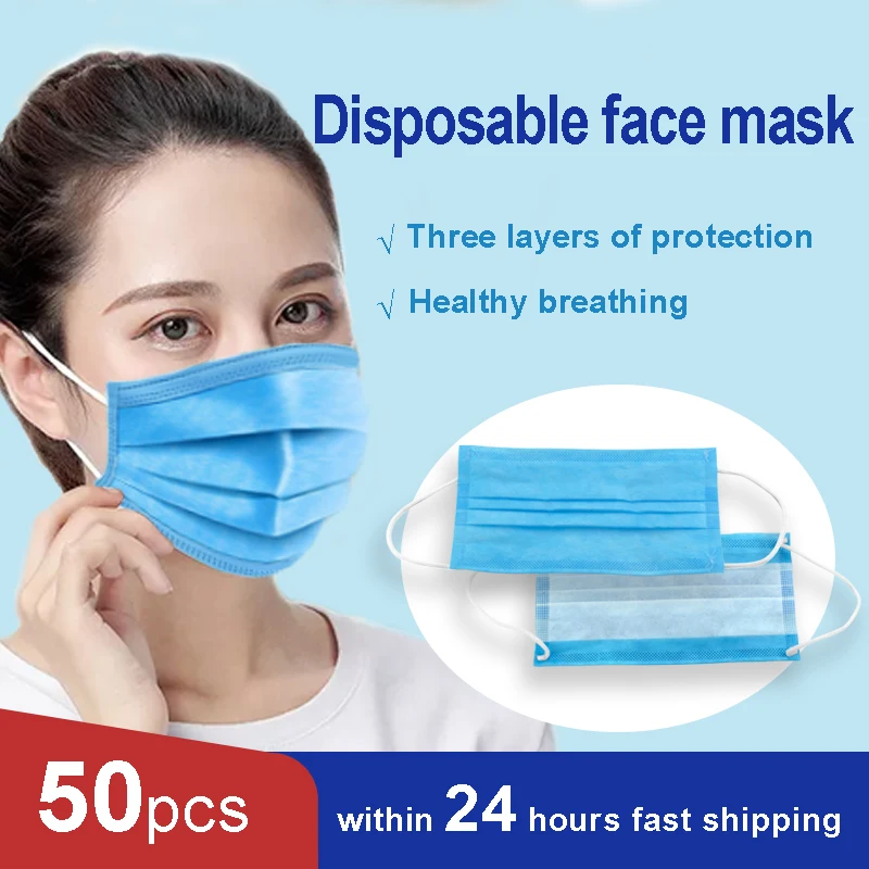 Fast Delivery Hot Sale 3-layer Mask 50pcs Face Mouth Masks Non Woven Disposable Anti-Dust Meltblown Cloth Masks Earloops Masks