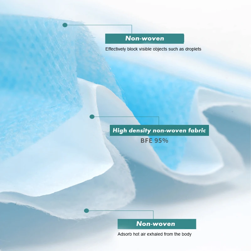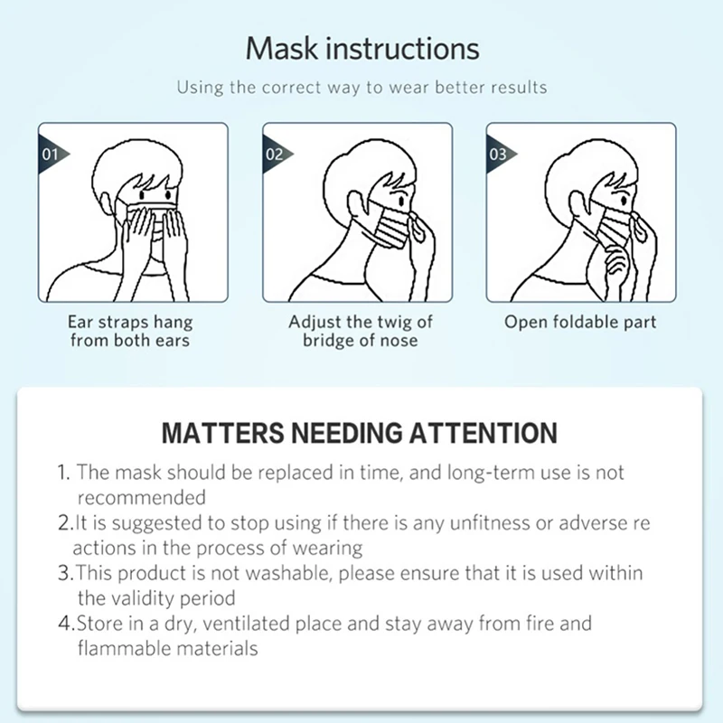 The mask is folded in three layers to form a three-dimensional breathing space;it has a hidden plastic bridge of the nose, prevents fog, and has a hidden cartilage bridge of the nose, which can avoid gaps and reduce the inhalation of harmful substances through adjustment. High elastic ear hanging, lower pressure.