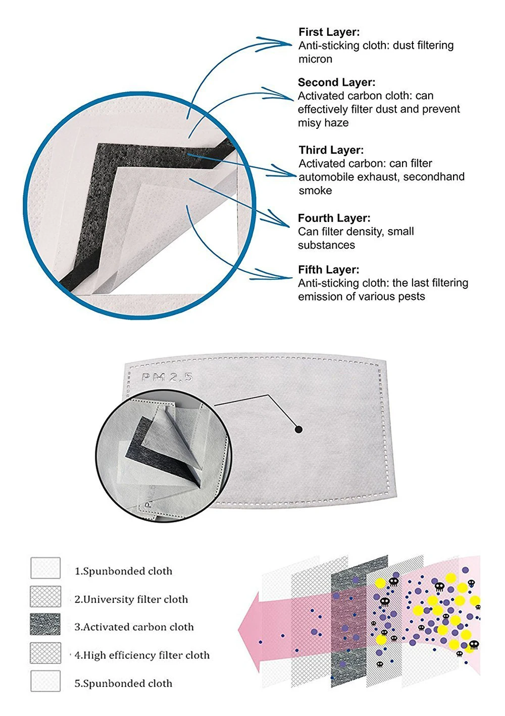 5.The fifth layer: Spunbond cloth, filter out all kinds of harmful substances;