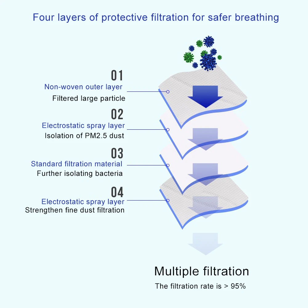 4 layers effective protect-ion, the filtration efficiency is up to 95%.